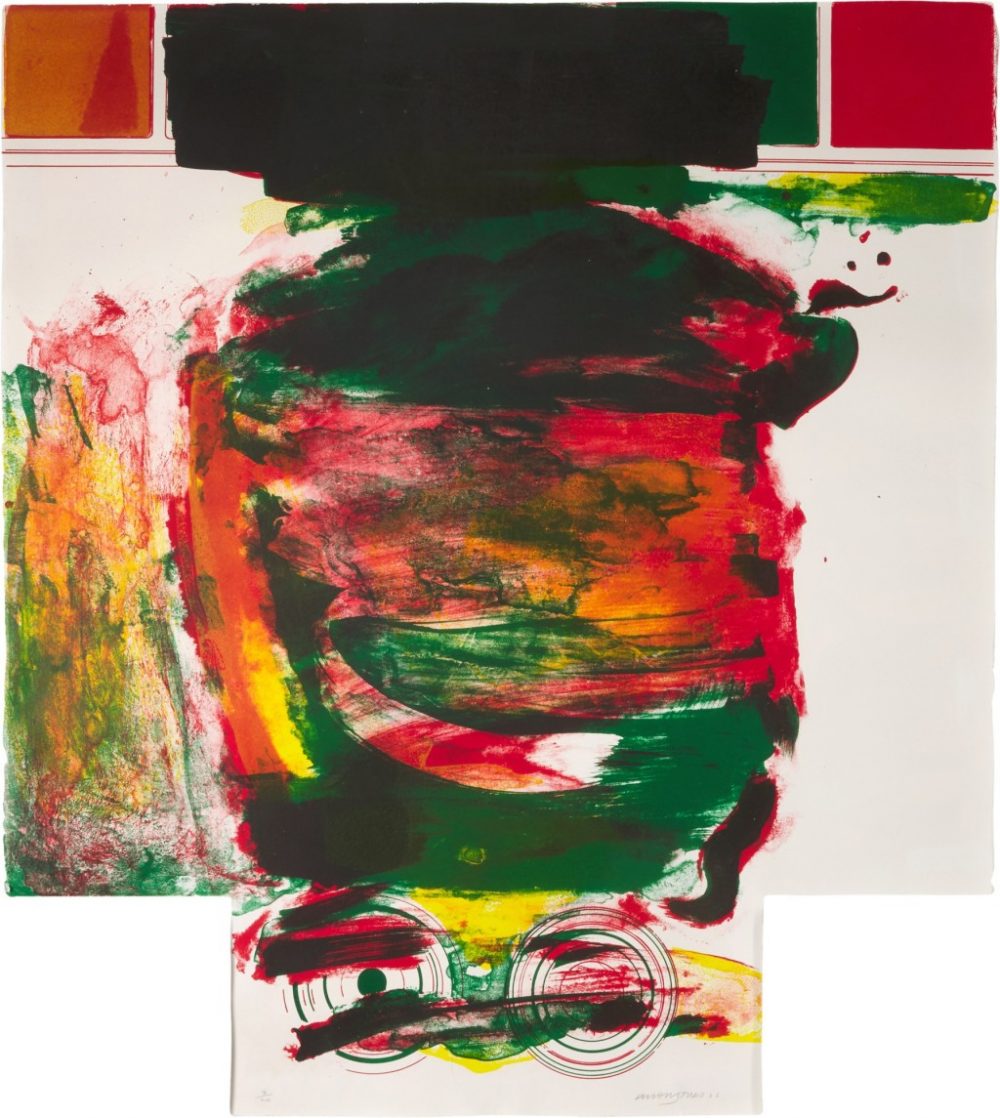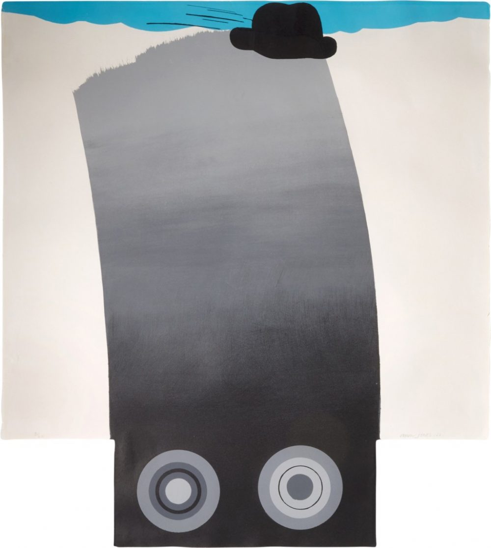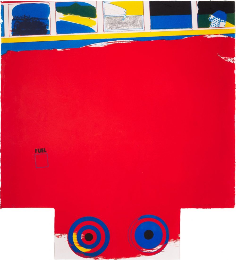 The shaped-canvas Bus paintings of 1962 were re-interpreted in lithographic form in this 1966 portfolio A Fleet of Buses. This was his first time working with the Tamarind Workshops, a portfolio of five intensely coloured and eccentrically shaped lithographs plus the title page. Although eager to work with one of the most esteemed print workshops in the country, and to learn from its member’ expertise, he proved himself to be unafraid of breaking the usual rules. Paper was meant to be handled with respect. Yet there was good reason to remove those sections of the printed sheet that would otherwise have been left blank: Jones conceived of the prints without their two lower corners, so that the two circular forms along the bottom edge would be read as the wheels of the vehicle, just as he had used small individual canvases to similar effect in this shaped bus paintings of 1962.