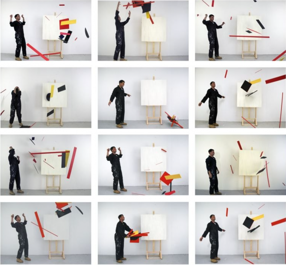 Declan performing his piece Presentness is Grease (2012), which touches on themes of theatricality, contingency and the element of chance; ideas also found in his woodcuts and watercolours.