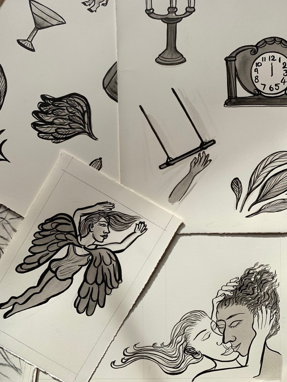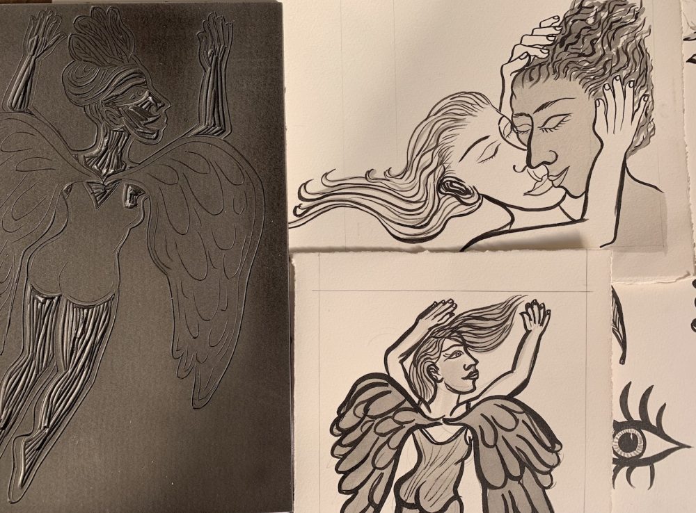 A selection of Eileen Cooper’s initial sketches and linocuts that draw inspiration from Angela Carter’s book ‘Nights at the Circus’.