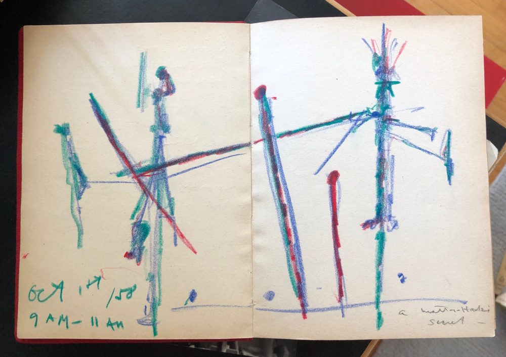 This drawing relates to a sculpture made by Roberto Matta in collaboration with the sculptor Dimitri Hadzi (1921 – 2006) in the late 1950s. Together they assembled a sculpture from found objects – such as twigs – in Hadzi’s Rome studio. It was later cast into bronze (pictured below).