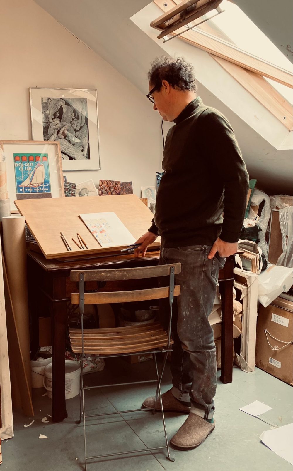 Aaron Kasmin working on the drawings in his studio in London, 2022.